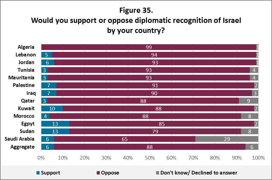 A most telling example of this is how Egyptians and Jordanians answered the AOI question “Would you support or oppose diplomatic recognition of Israel by your country?” The interesting thing about this question is that both Cairo and Amman already recognized Israel and have diplomatic ties with Tel Aviv since 1979 and 1994, respectively. Still, to this day, 93 percent of Jordanians and 85 percent of Egyptians still oppose that recognition as if it never took place.