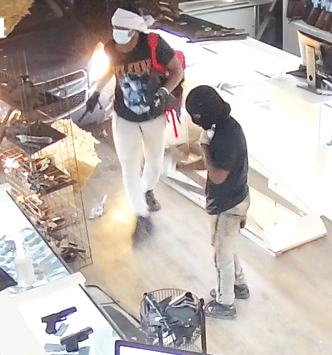 Just after midnight on Sept. 12, more unknown suspects returned to the business, drove another vehicle through the then boarded-up building and stole several more weapons.