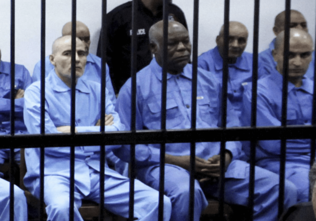 Abu Agila Mohammad Mas’ud Kheir Al-Marimi, also known as Mohammed Abouajela Masud, (second from left) sits behind bars during a hearing at a courtroom in Tripoli, November 16, 2014.– REUTERS