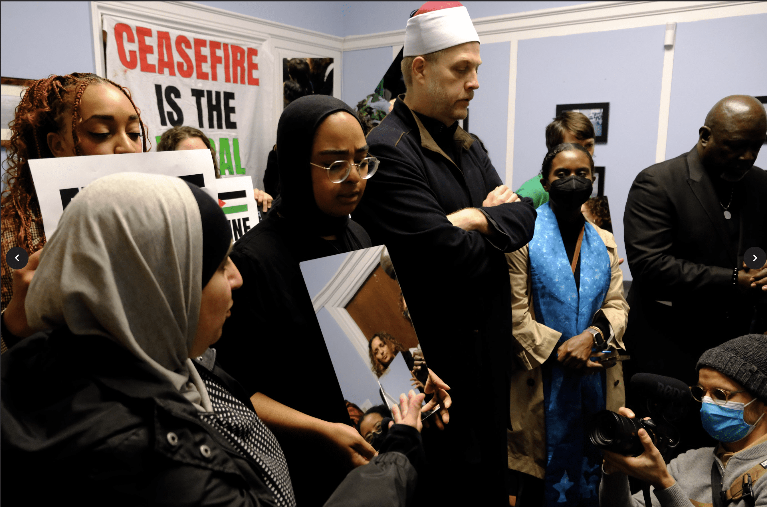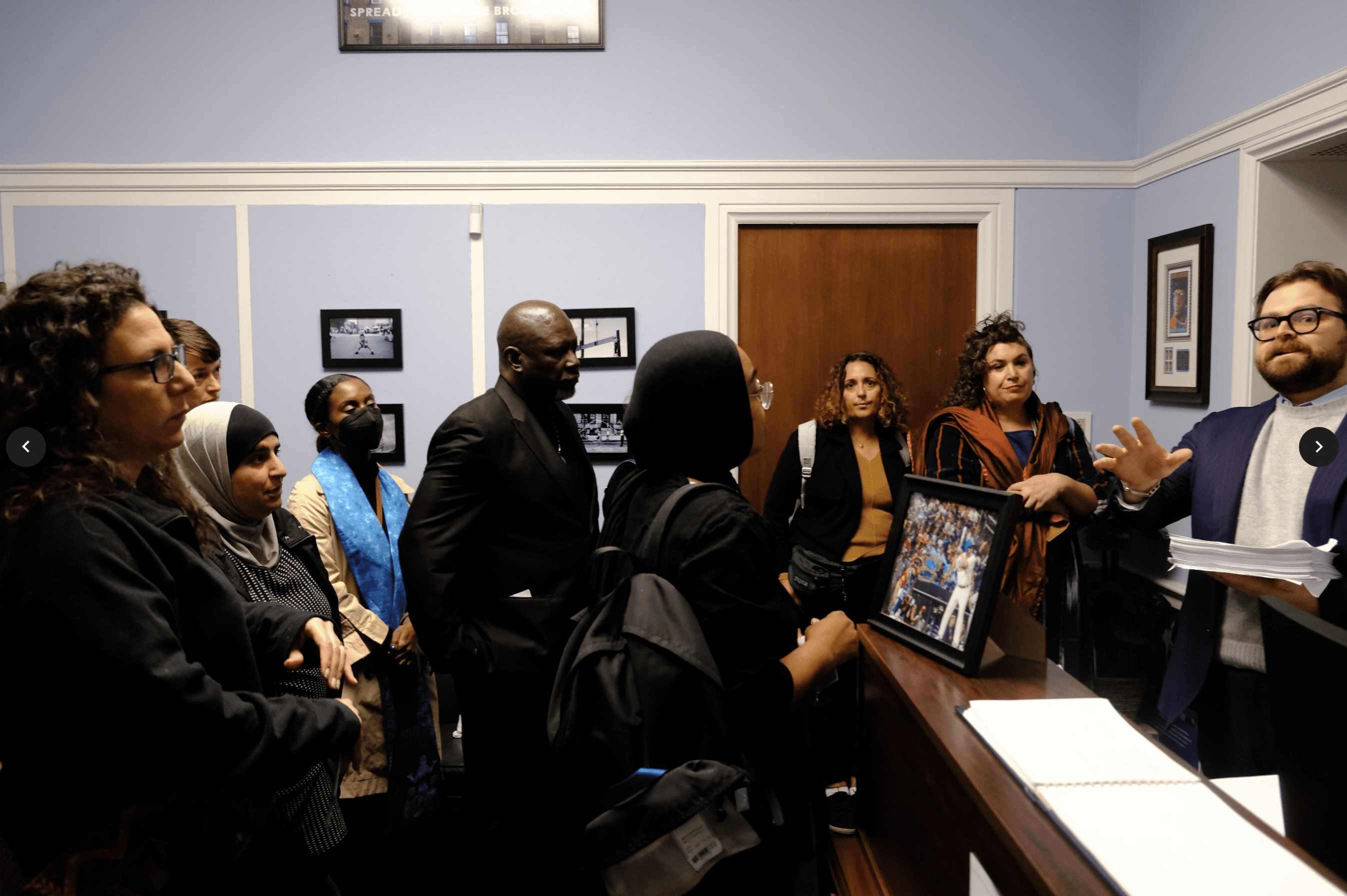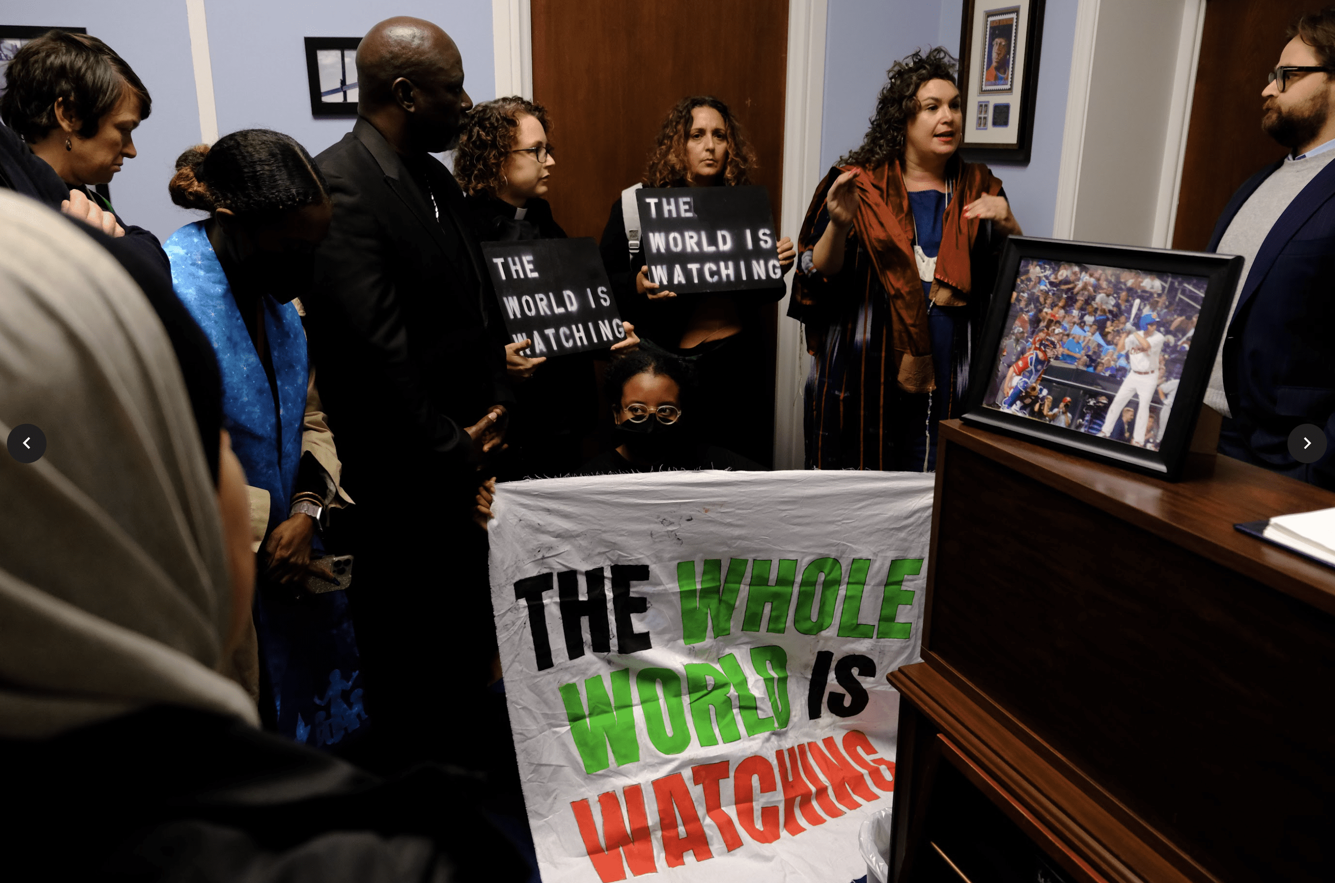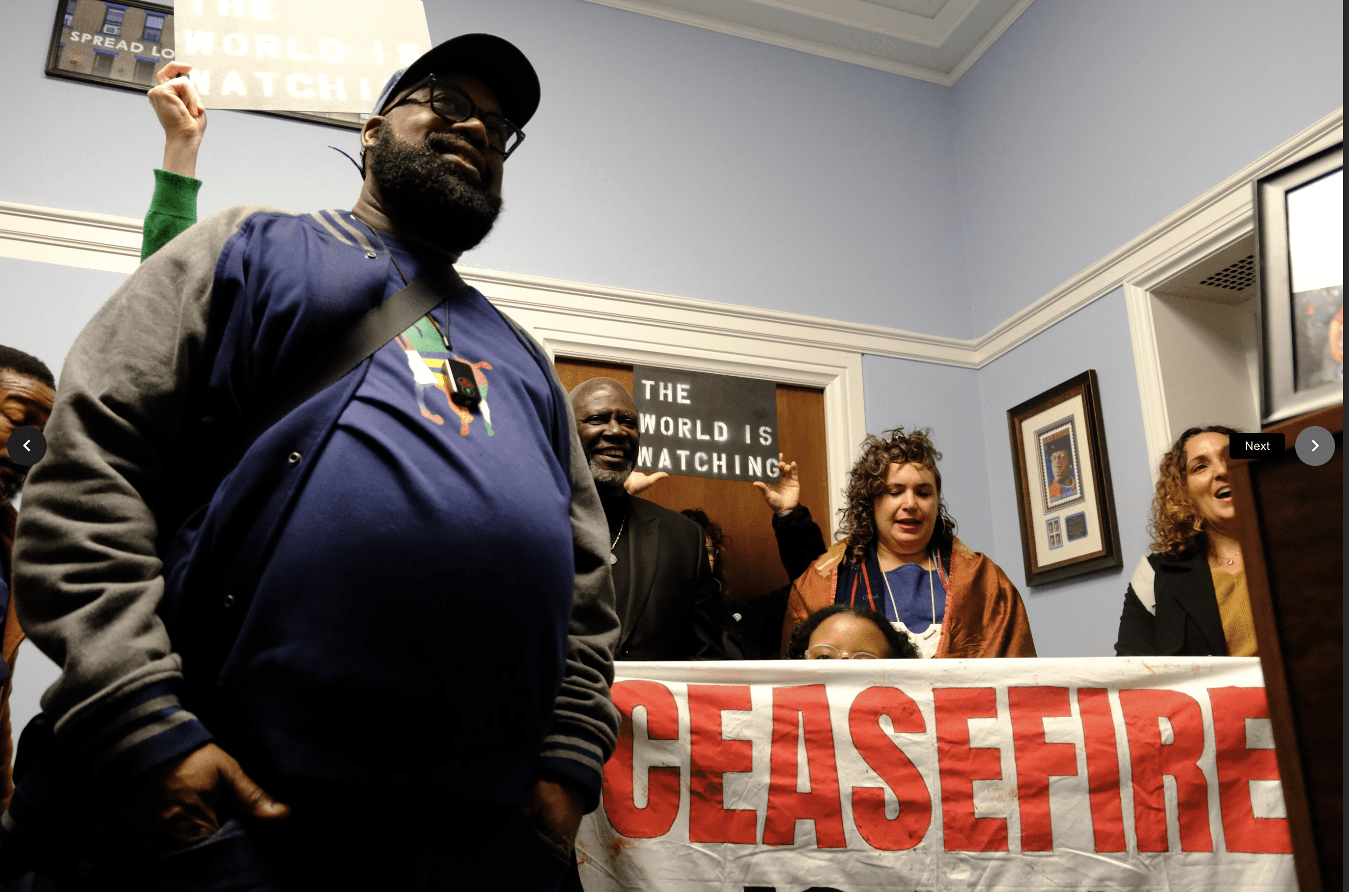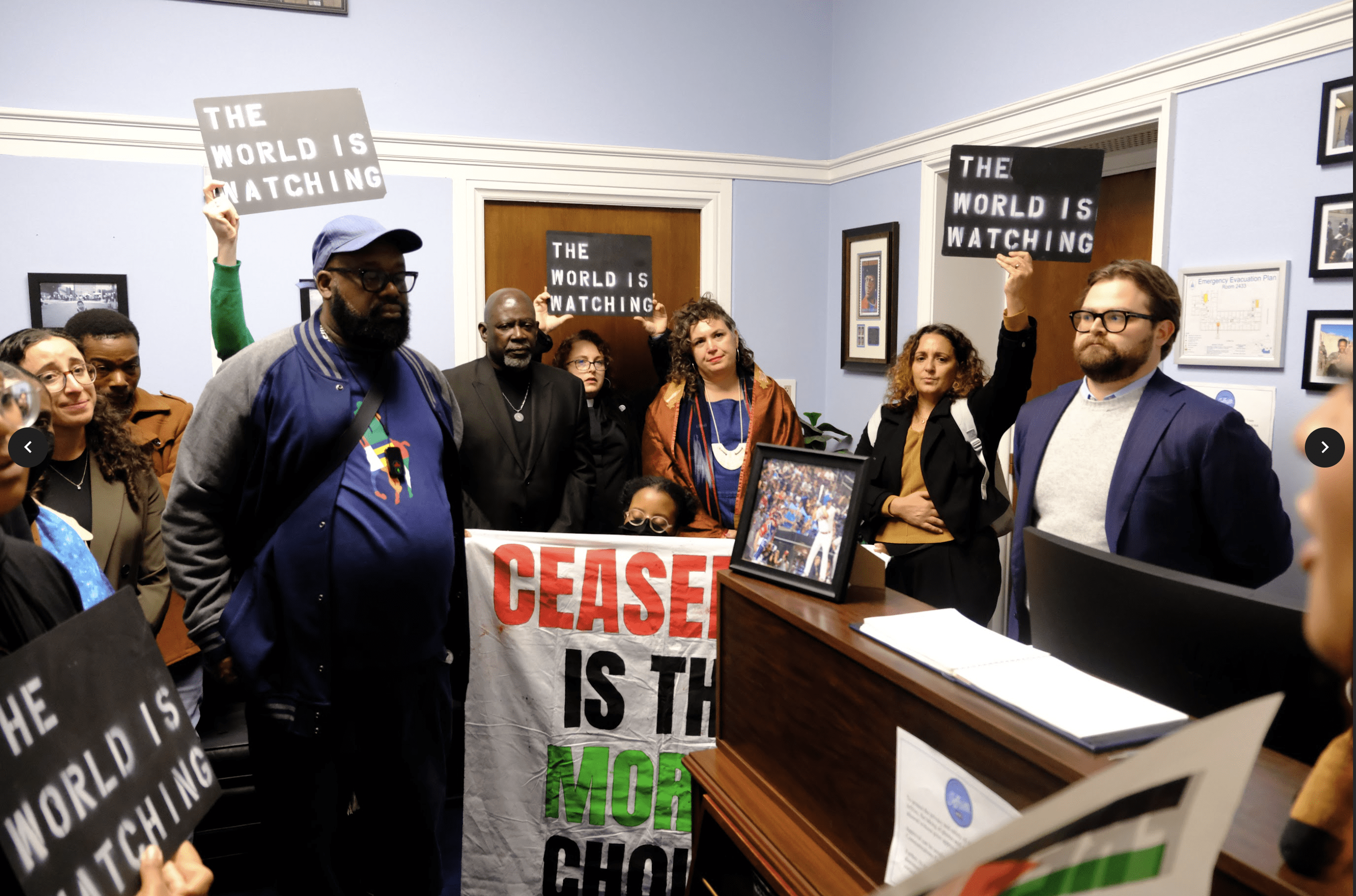 WASHINGTON, D.C. – On Tuesday, a group of about 40 multiracial Christian, Jewish and Muslim faith leaders and activists occupied House Minority Leader Hakeem Jeffries’ Rayburn office to lead a pray-in for an immediate ceasefire in Gaza as the only moral choice.