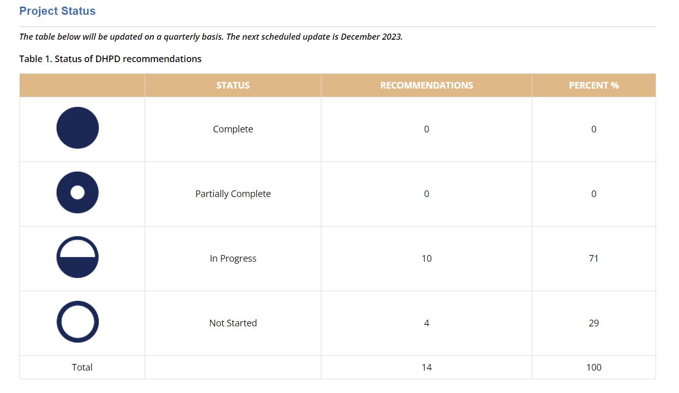 Screenshot of Table 1. Status of DHPD recommendations from DOJ-COPS