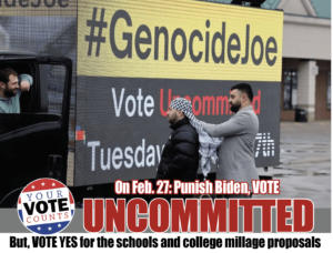When the votes are tallied and the numbers are reported, if we vote hard and in block, our unified voice will be heard louder and clearer. By the way, we are not alone in this battle of public opinion and at the polls. Many Americans are voting “UNCOMMITTED” in this presidential primary mainly because of America’s complicity in dirty wars overseas while neglecting the needs of the American people at home.
