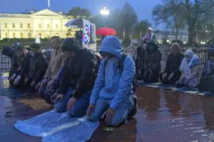 “Protesters pray during a demonstration in support of Palestinians on April 2 at Lafayette Park across from the White House in Washington.” Photo: JOSE LUIS MAGANA / AP