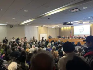More than 200 members of the public showed up for the meeting and about 50 of them waited outside. Police stood outside the building, at the door, in the hallway and in the meeting room and allowed more people into the building when other people left, as they said the room was at capacity. The final public commenters were able to enter the building about two and a half hours after the start of the meeting after listening to it through speakers outside in the 46 degree weather.