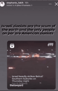 Fakih posted a story to her private Instagram on Oct. 4 that says “Israeli Zionists are the scum of the earth and the only people on par are American Zionists.”