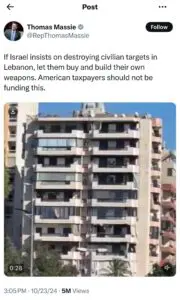 Massie posted his thoughts on X alongside a video clip of an Israeli missile hitting and destroying a residential building in Lebanon. In his post he wrote, “If Israel insists on destroying civilian targets in Lebanon, let them buy and build their own weapons. American taxpayers should not be funding this.”