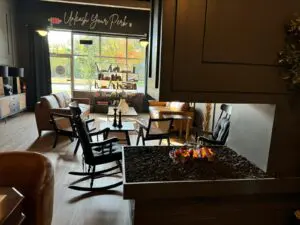 A bookshelf stands at the front of the café with tables filling the open space and picture-framed mirrors lining the wall. An indoor fire pit and a chess table sit in the center, yielding a space for conversation and activity. The warm ambiance creates a comfortable space whether customers plan to work, study, socialize or simply enjoy a cup of coffee.
