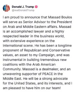 Trump wrote on his social network, “Truth Social”, “I am pleased to announce that Massad Boulos will serve as the president’s senior advisor on Arab and Middle Eastern Affairs”, describing the Lebanese billionaire as a “skilled lawyer and a respected leader in the business world, with extensive international experience.”