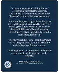 In a letter to Harvard on Thursday, Noem said the school’s sanction is “the unfortunate result of Harvard’s failure to comply with simple reporting requirements.” It bars Harvard from hosting international students for the upcoming 2025-26 school year.