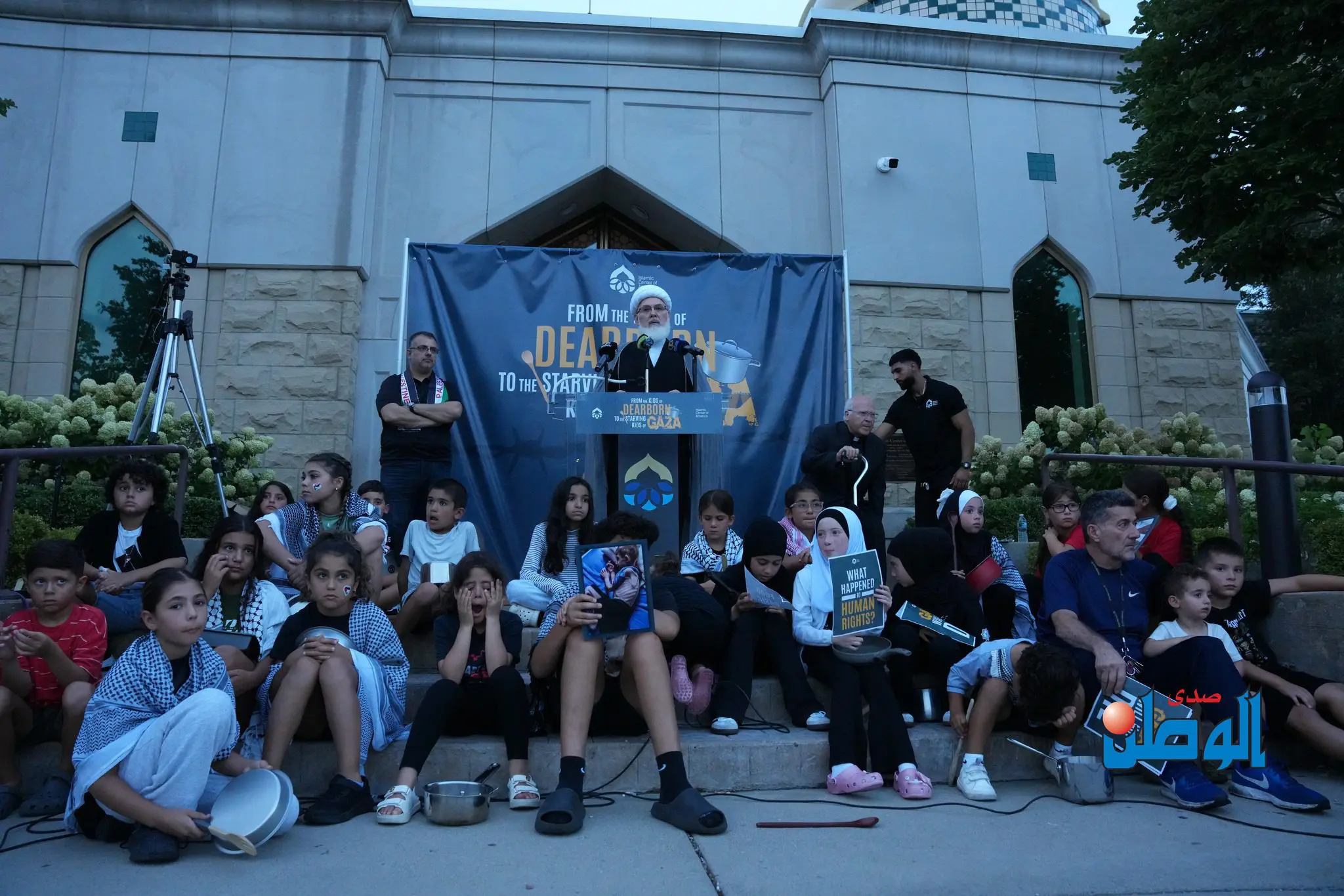 DEARBORN – Dozens of Arab American children and their families held a rally on Tuesday evening in solidarity with the hungry children of Gaza, in front of the Islamic Center of America in Dearborn. They carried empty pots and food containers in protest against Israel’s starvation policies imposed on the Strip’s residents since March.