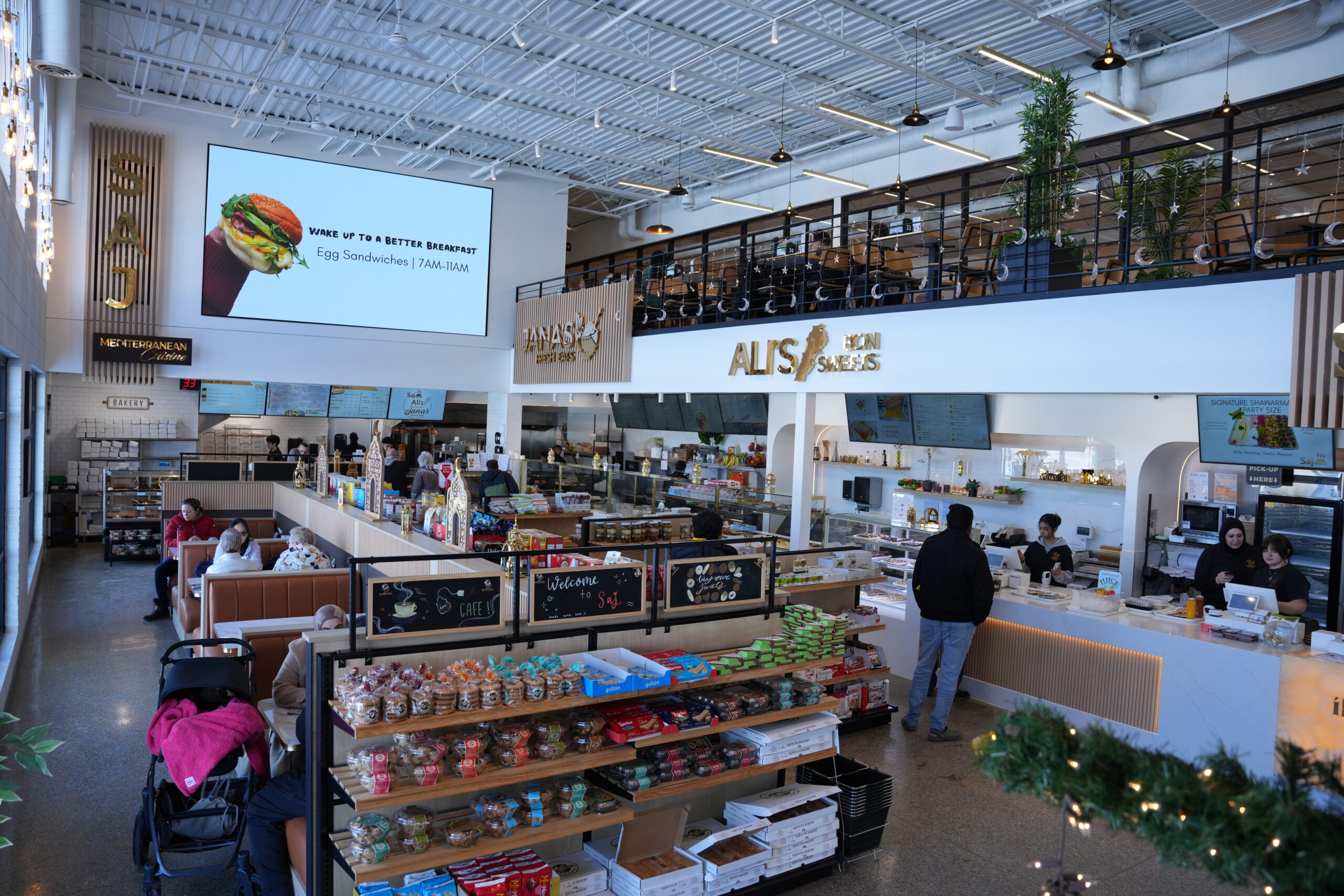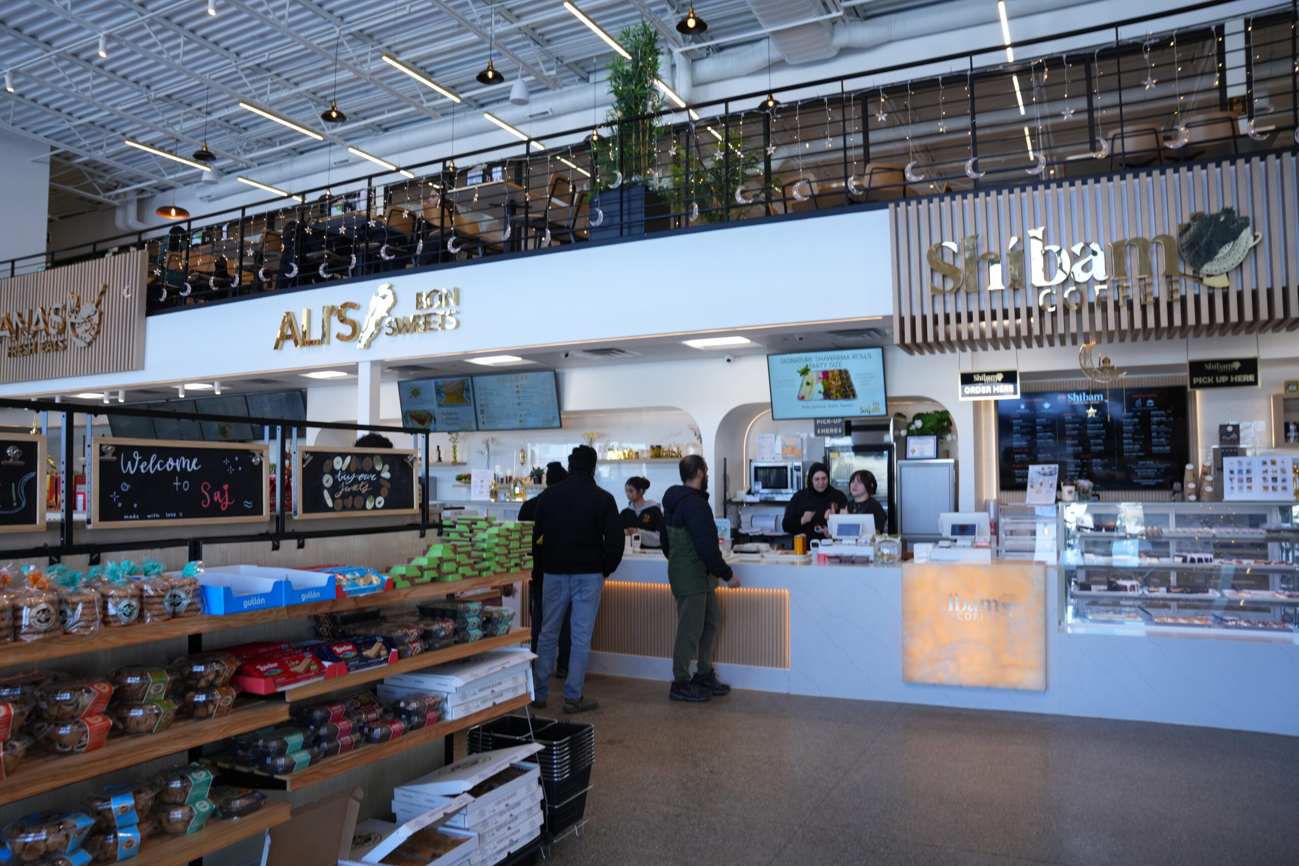 On the ground floor, visitors will find Saj’s fresh bakery — where breads, pies, sandwiches, salads and pastries are prepared fresh daily in an open-kitchen style — alongside Shibam Coffee and Ali Bon Sweets, and adjacent to a grocery market operated by Greenland Supermarket.