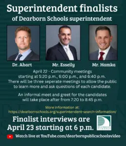 The three finalists are scheduled to visit the district on Wednesday, April 22, when they will tour schools, meet with key stakeholders and learn more about the Dearborn Public Schools community.