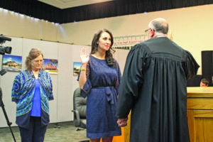 Newly appointed school board trustee Celia Nasser taking the oath of office, administered by Judge Salem Salamey