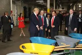 In late April, Trump marked his 100th day in office with a visit to the AMES plant. With workers chanting “USA, USA,” Trump asked if every part of the wheelbarrows was made in America.
