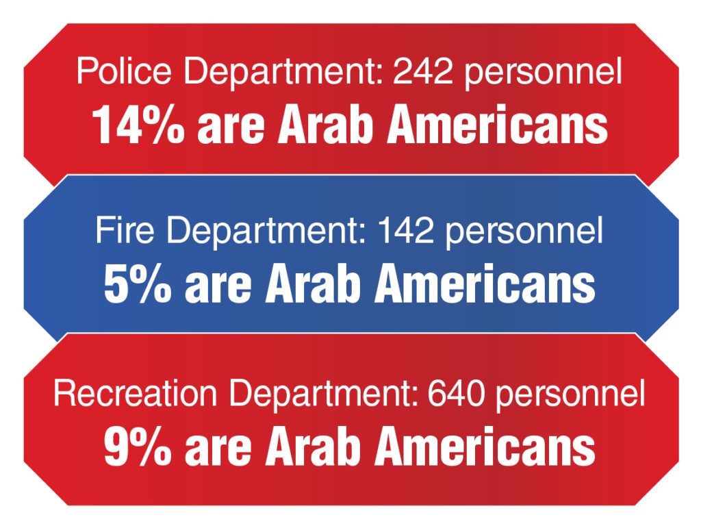 Of the city’s 1,507 full-time and part-time employees in every department– from a sewage maintenance mechanic to a police officer and the mayor – 12 percent have last names that appear to be from an Arab background, according to city records as of the beginning of August.