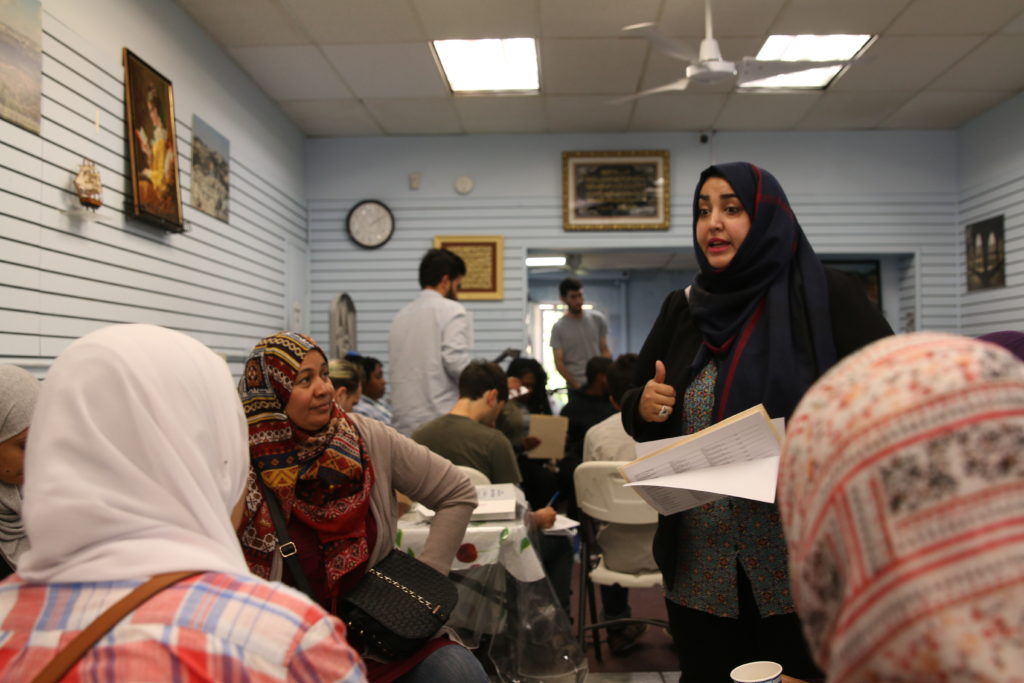 Somia Elrowmein trains volunteers in Arabic before they canvas the neighborhood three days before the primary