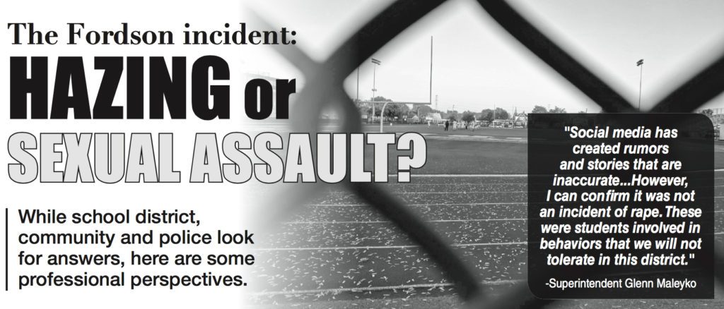 “Hazing is a form of bullying and can be considered harassment,” Fordson Principal Heyam Alcodray said in a letter to parents last week. “…On behalf of all students and staff members at Fordson, I extend our most sincere apologies to the victim of this rogue hazing incident.”