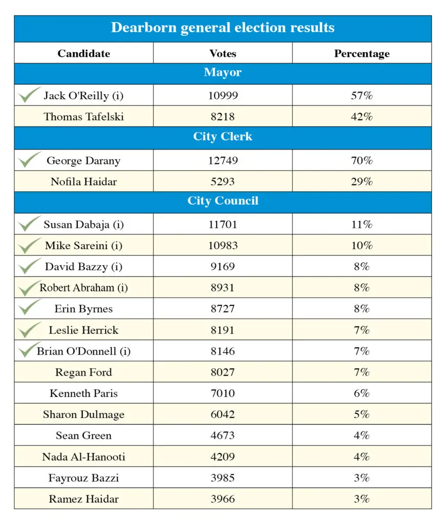 In order of votes received, five incumbents were re-elected to the Council: Susan Dabaja, Mike Sareini, David Bazzy, Robert Abraham and Brian O’Donnell.