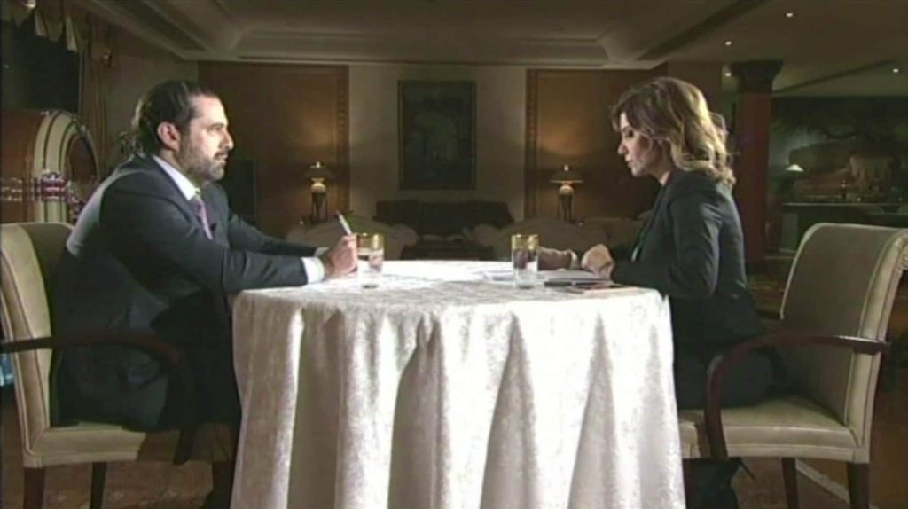 Lebanon’s Prime Minister Saad Hariri gives a live TV interview with Paula Yacoubian, a reporter from Future TV, in Riyadh, Saudi Arabia, Sunday Nov. 12, 2017