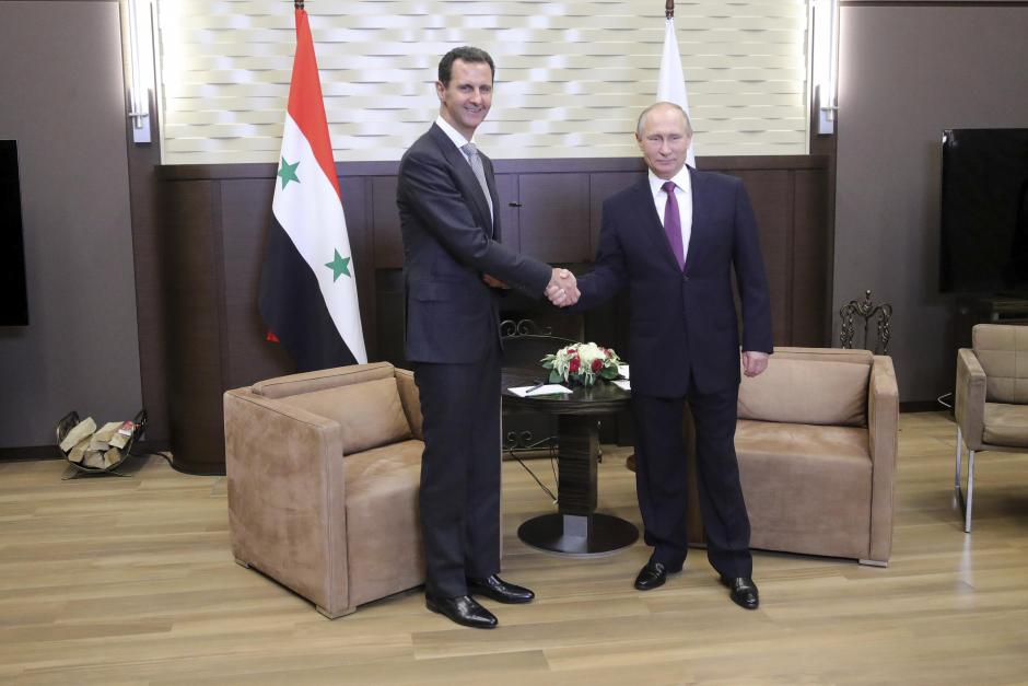 Russian President Vladimir Putin (R) shakes hands with Syrian President Bashar al-Assad during a meeting in the Black Sea resort of Sochi, Russia November 20, 2017. -Kremlin via REUTERS