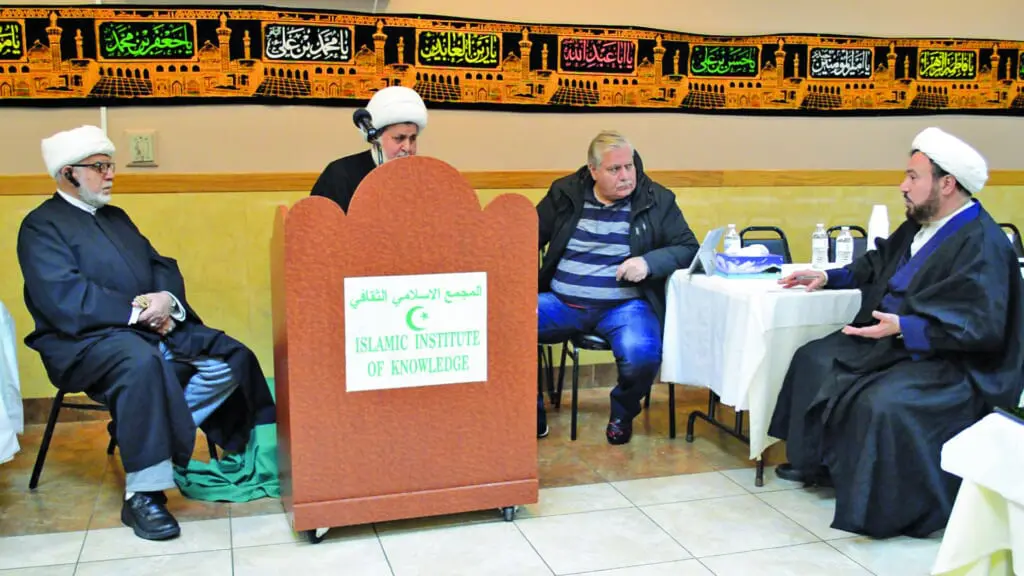 Local imams, including The Islamic Institute of Knowledge leader Sheikh Abdulatif Berry, Karbalaa Center leader Sheikh Husham Al-Husainy with The AANews Publisher Osama Siblani discussing repercussions of the reenactment of the Arba’een procession – Photo By The AANews