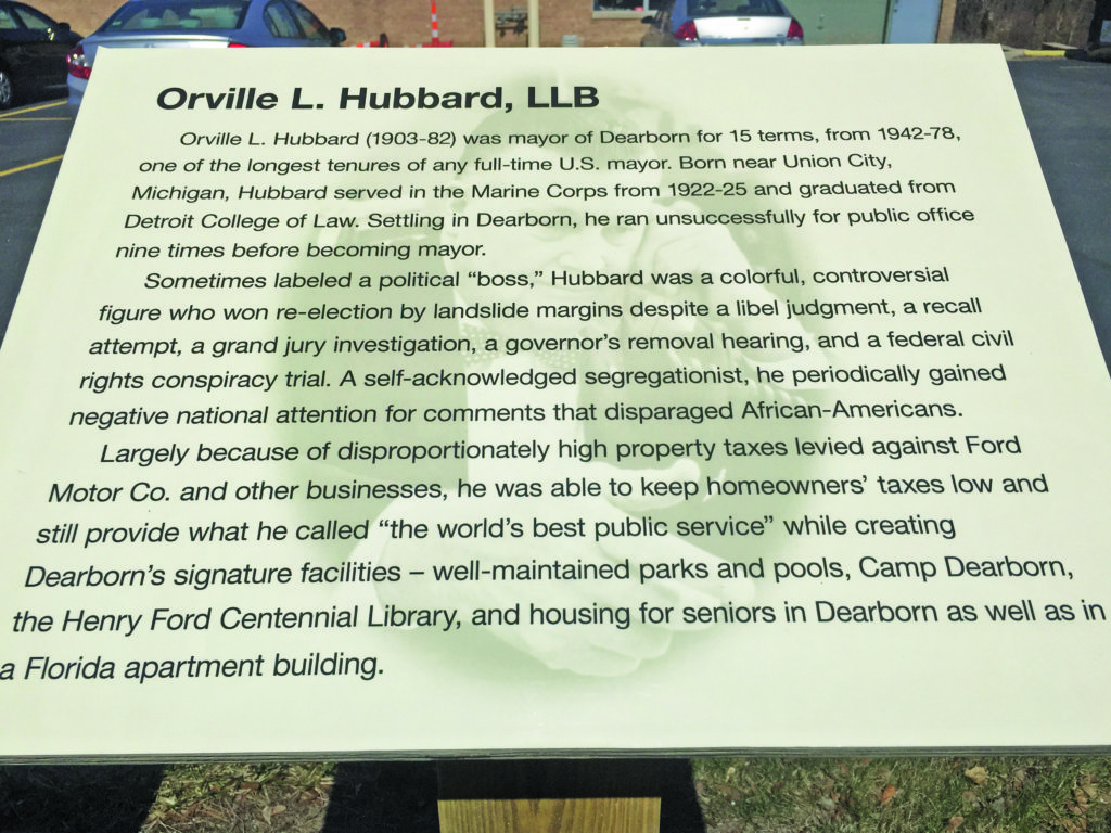 The plaque placed behind the Orville Hubbard statue outside of the Dearborn Historical Museum