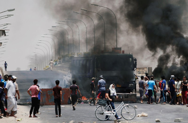 Iraqi protesters burn tires and block the road at the entrance to the city of Basra, Iraq July 12, 2018. REUTERS
