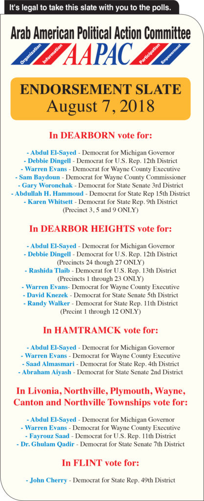 After interviews and deliberations on August 1, The Arab American Political Action Committee (AAPAC) endorsed candidates for state representative, state senator, Wayne County executive and a judge on the Wayne County Probate Court. Its members sought to give young and new candidates an opportunity to bring about change and to bring Arab American issues to the table in local and state governmental institutions.
