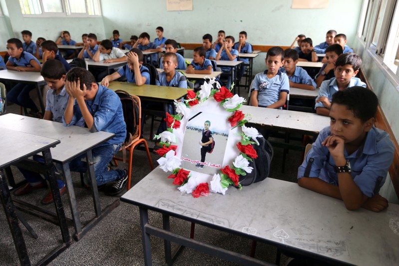 A picture of 12-year-old Palestinian boy Nassir al-Mosabeh, who was killed during a protest at the Israel-Gaza border fence, is seen on his table as his classmates react at a school, in Khan Younis in the southern Gaza Strip September 30, 2018. REUTERS