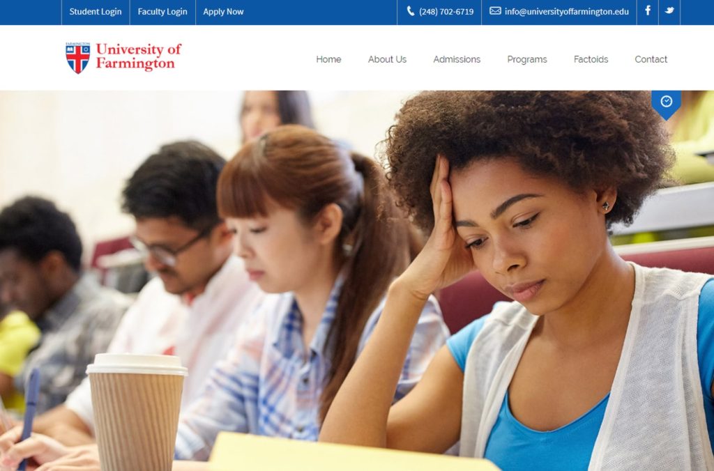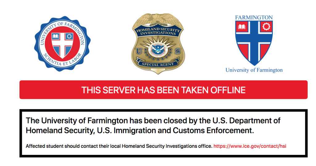 The University of Farmington website has been taken down by the Department of Homeland Security. Website visitors will now be greeted by a message from department which can be viewed at https://universityoffarmington.edu.