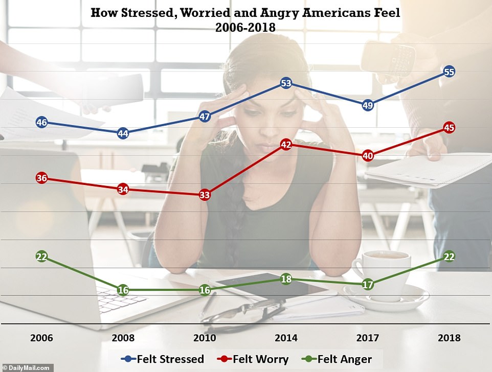 Last year, Americans reported feeling stress, anger and worry at the highest levels in 10 year, according to the survey released Thursday.