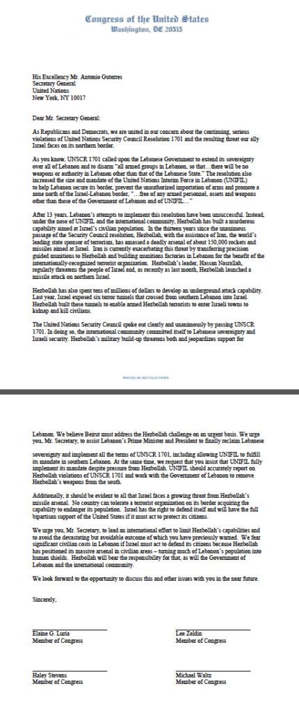 This week, four members of the United States House of Representatives sent a letter to the United Nations Secretary-General expressing their “concern about the continuing, serious violations of United Nations Security Council Resolution 1701 and the resulting threat our ally Israel faces on its northern border.”
