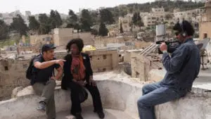 Cameraman Issa Aslan rolls tape as Maqdisi gives Aleta Hayes a tour of the West Bank.