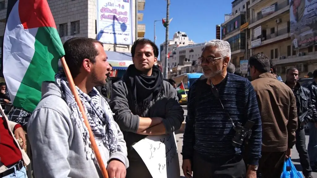 In this still from the film, former Stanford University student and Palestinian activist Fadi Quran (center) brings his professor, Dr. Clayborne Carson (right), to a non-violent demonstration in the West Bank.