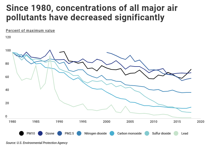 Although levels of nitrogen dioxide, carbon monoxide, sulfur dioxide, and lead have decreased by 40 percent since the 1980s, ozone and particle pollution continue to present a major public health risk (Source U.S. EPA).