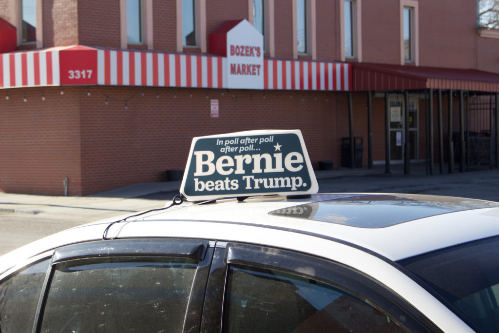 A vehicle displays a pro-Sanders sign outside of a campaign office in Hamtramck.