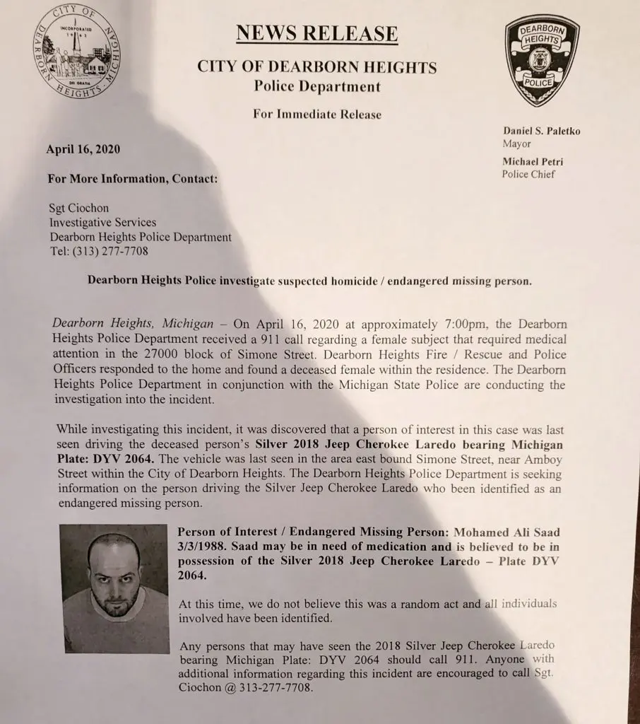 Dearborn Heights Police called Saad a “person of interest” and an “endangered missing person” in the case. He is need of medication. Police said that all individuals involved have been identified and that they do not believe this was a random act.