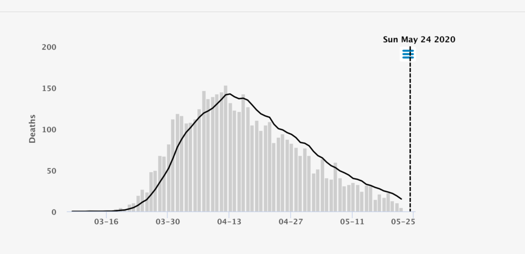 Deaths from COVID-19 in the “Detroit” region, which includes Wayne, Macomb, Oakland and other major counties. Source: MI Start Map