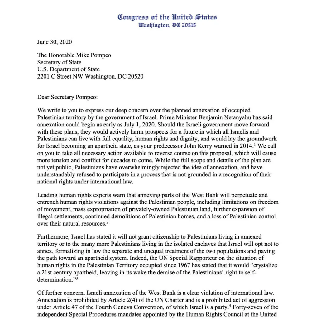 The letter is also supported by the following organizations: American-Arab Anti-Discrimination Committee (ADC), Arab American Institute, American Friends Service Committee, American Muslims for Palestine, Center for Constitutional Rights, Churches for Middle East Peace (CMEP), CODEPINK, Defense for Children International Palestine, Demand Progress, Emgage Action, Freedom Forward, Friends Committee on National Legislation, Global Ministries of the Christian Church (Disciples of Christ) and United Church of Christ, IfNotNow, Jewish Voice for Peace Action, Just Foreign Policy, Maine Voices for Palestinian Rights, New Internationalism Project (a project of Institute for Policy Studies), SumOfUs and U.S. Campaign for Palestinian Rights.