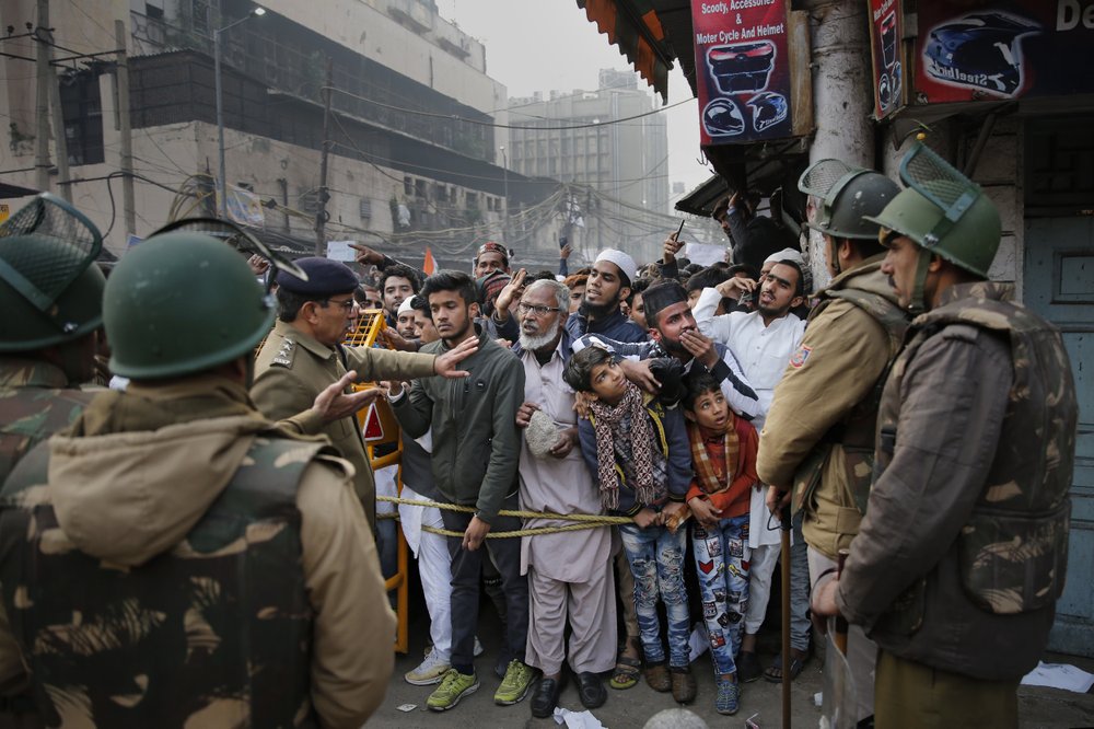 Indian policemen stop protesters of India’s discriminatory citizenship law at a police barricade in New Delhi, Dec. 20, 2019. Photo: Altaf Qadri/AP