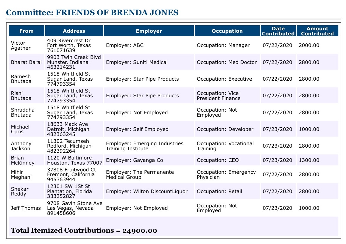 The Jones campaign’s financial records reveal donations from the Bhutadas, spokespeople for the #HowdyModi U.S.-India engagement campaign, who welcomed Trump and Modi to a sold-out rally in Texas last year.