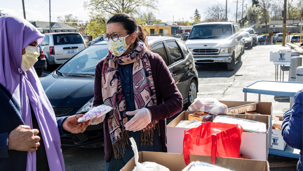 U.S. Rep. Rashida Tlaib (D-Detroit) gives away COVID-19 essentials during a volunteer event in her district. Photo courtesy: The Rashida Tlaib campaign