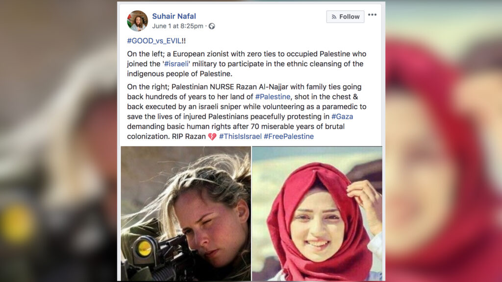 The former Israeli soldier, Rebecca Rumshiskaya, sued Nafal in September over a viral Facebook post she published in 2018 regarding the killing of Palestinian nurse Rouzan al-Najjar at the hands of the Israeli army at a protest at the border in the Gaza Strip.