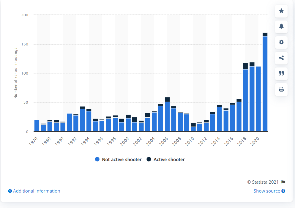 Number of K-12 school shootings in the United States from 1970 to September 2021, by active shooter status. Data from statista.com