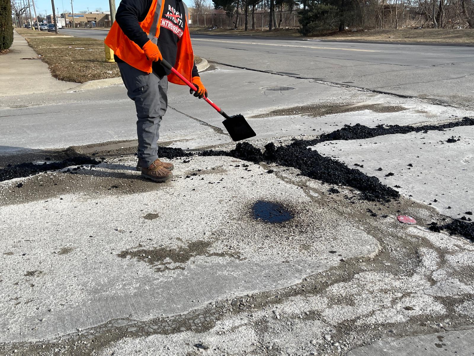 A city of Dearborn road maintenance worker fills out damaged segments of Miller Road, Thursday, March 3. Photo: Imad Mohamad/The Arab American News