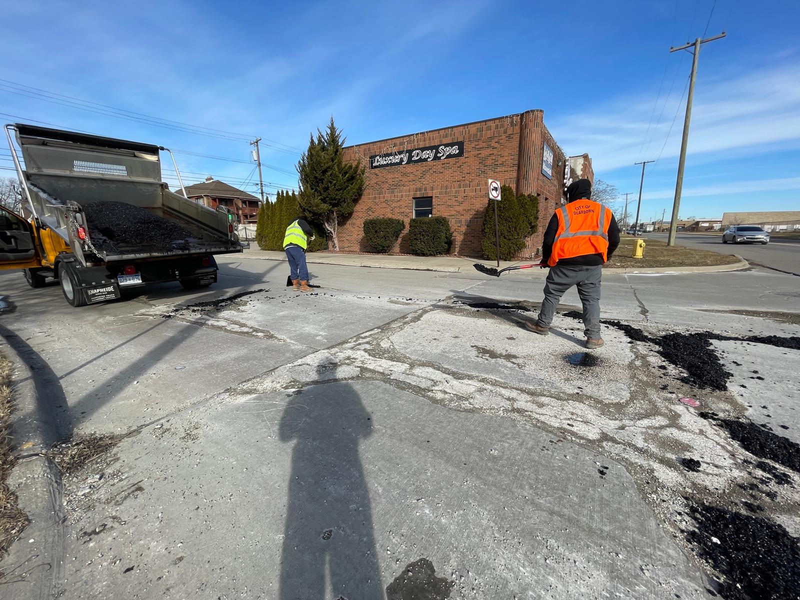 A city of Dearborn road maintenance crew fills out damaged segments of Miller Road, Thursday, March 3. Photo: Imad Mohamad/The Arab American News