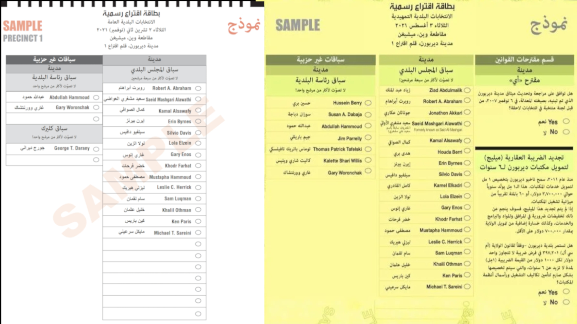 In the 2021 election cycle, sample ballots were translated after public pressure to repeat the process locally. That year, The Arab American News had worked to translate sample ballots, for a fee, at the request of the Dearborn City Clerk.