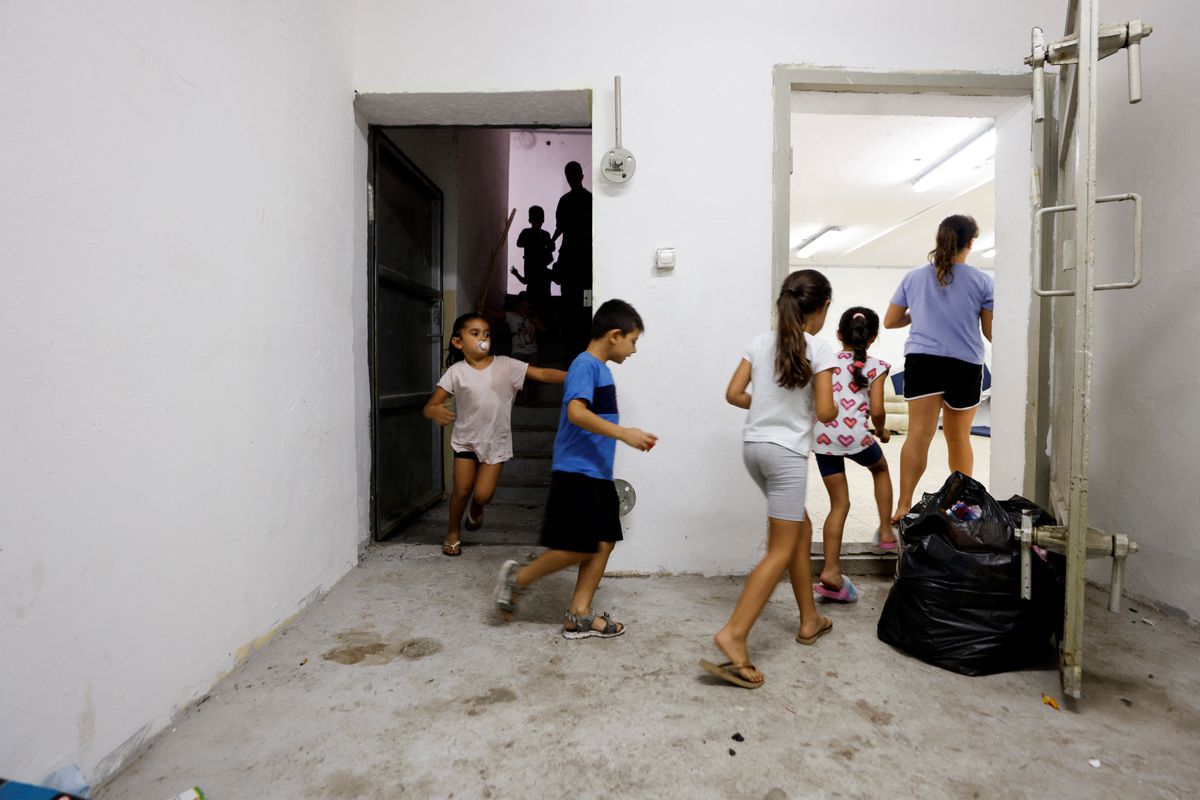 Israeli children run inside a bomb shelter as a siren goes off, indicating incoming rockets fired from Gaza towards Israel, in Ashkelon, Israel, Aug 7. Photo: Reuters