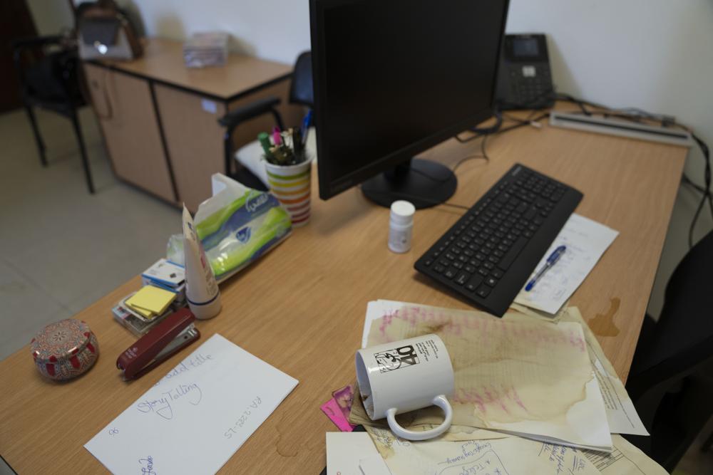 Spilled coffee on a desk at the al-Haq Human rights organization that was raided by the Israel army in the West Bank city of Ramallah, Aug. 18. Photo: Nasser Nasser/AP