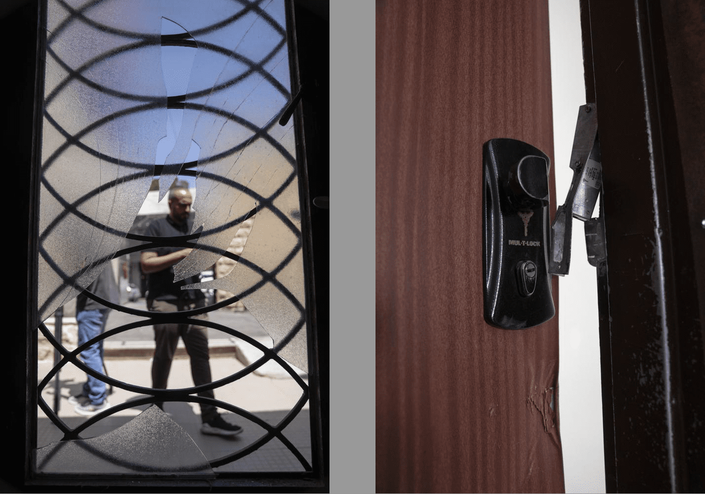 (Left) Glass of the main entrance of the St. Andrew’s Anglican Episcopal Church was shattered by the Israeli army during its raid of the al-Haq Human rights organization office on Aug. 18. (Right) The damaged entrance of the office of the al-Haq Human rights organization. Photo: Nasser Nasser/AP/File